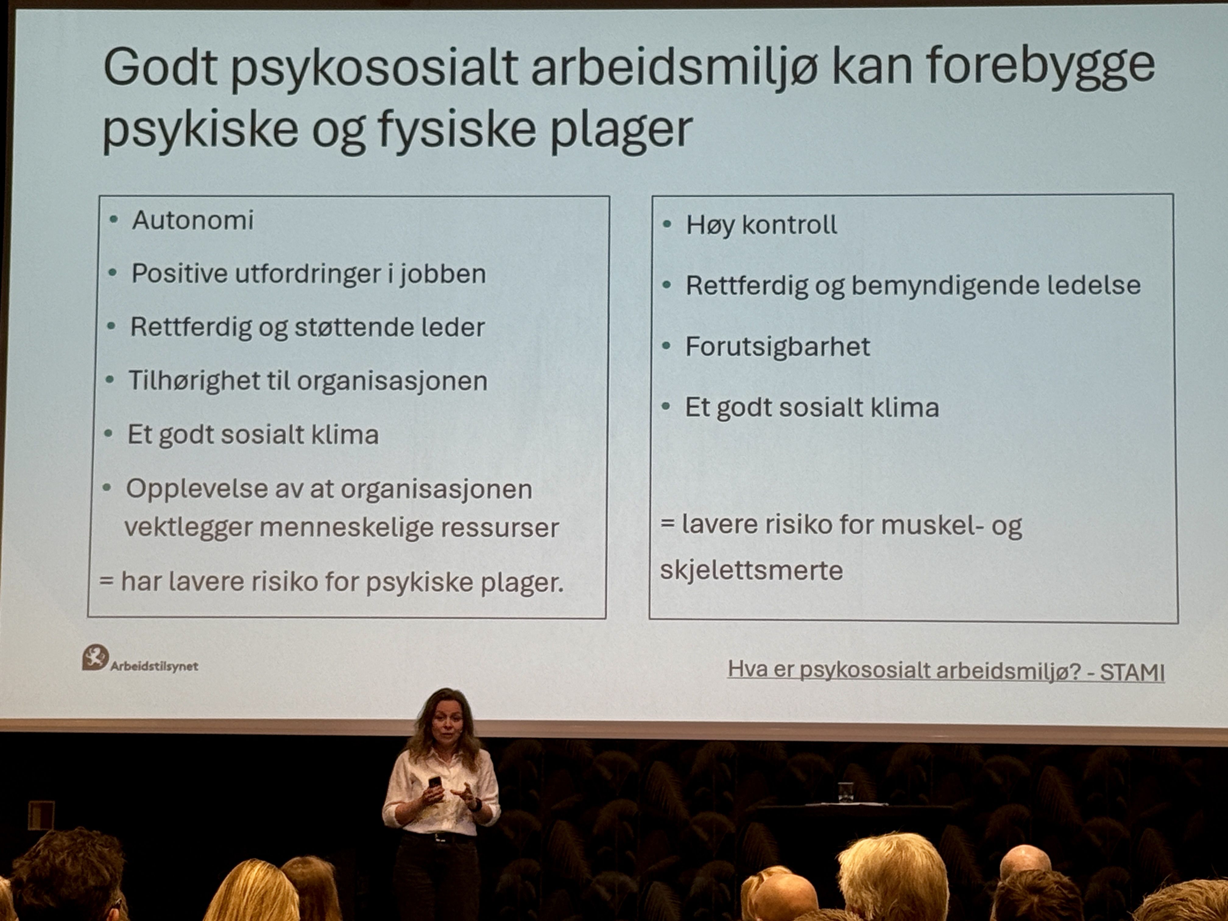 Marianne Ranum fra Arbeidstilsynet åpnet sesjonen og gav informasjon om det nye regelverket som kom i 2026. Rektor Ingun Elvhaug fra kulturskolen i Nes kommune delte sine erfaringer med hvordan de jobber systematisk med å skape et godt arbeidsmiljø.