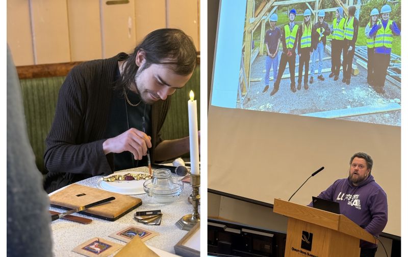 Tore Gramo fra Håndverkslaget snakket om hvordan de siden 2018 har jobbet med bidra til økt kunnskap og interesse for å ivareta kulturarven vår. Til venstre: Eirik Nordheim Pettersen som er en av fire med i Norge med svennebrev i forgylling.